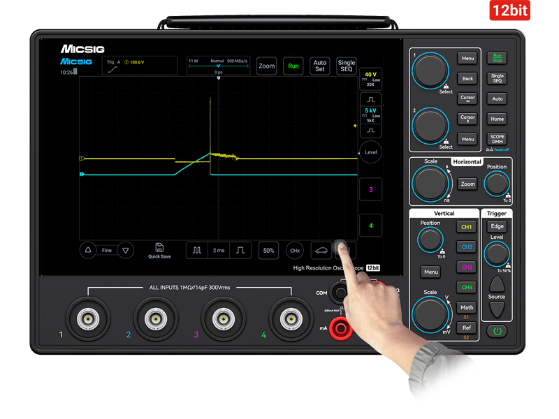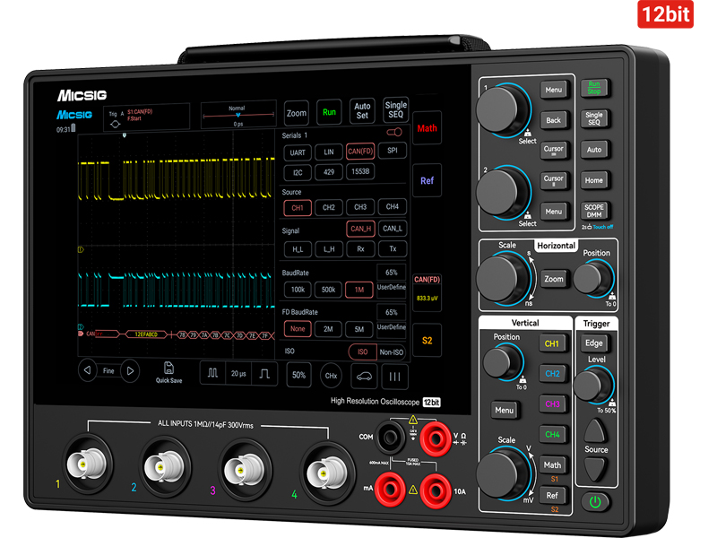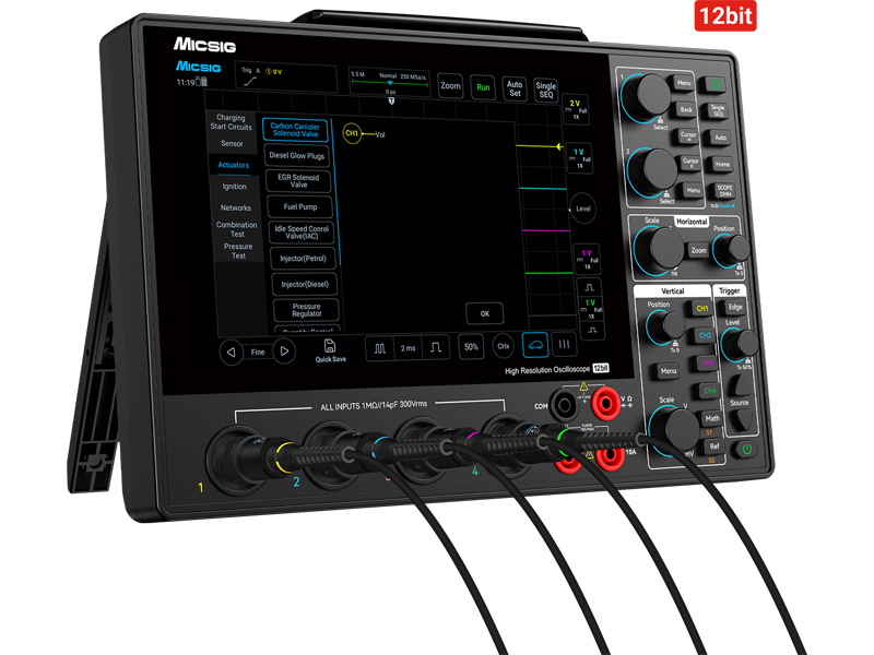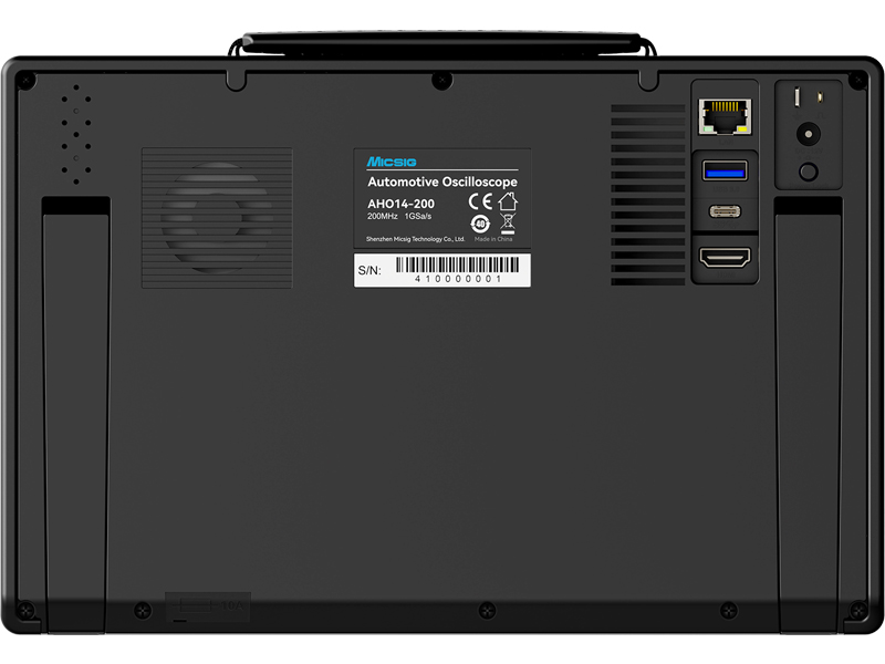 Micsig AHO1 Series is a professional high resolution automotive oscilloscope designed for vehicle diagnostics. It features a 12 bit ADC, 200 MHz bandwidth, 4 analog channels, a real time sampling rate of 1 GSa/s, and a memory depth of 110 Mpts. Its ultra slim 3.1 cm portable design, built in high capacity Li ion battery, and USB Type C charging make it ideal for mobile and outdoor repair applications.