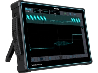 The tablet oscilloscopes offer an innovative touch operation with high usability and comes with bus decoding & trigger for I2C, SPI, RS232 and CAN. The performance with up to 70M sample memory and 130'000 wfm/s is also impressive. With the LAN, WLAN and USB interfaces, the device is ideally connected to the outside world and it can be conveniently remote controlled with the supplied software. The standard HDMI output is suitable for live transmission to a beamer, for example. With its large battery capacity and robust design, the device is also ideally suited for use in the field.