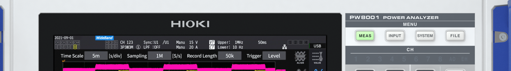 The PW8001 sets a new benchmark for complete power analysis solutions with Hioki being the only manufacturer that offers industry-leading power analyzers and a wide portfolio of high-accuracy current sensors both developed and manufactured by Hioki. This enables to align their performance and results in more accurate and stable measurements from DC to high frequencies and low power factor measurements thanks to functions like the automatic phase shift correction.