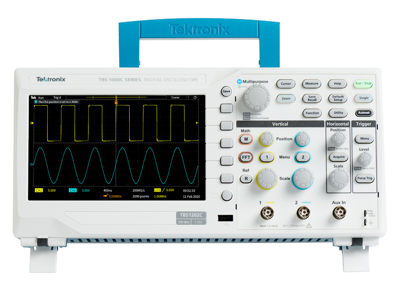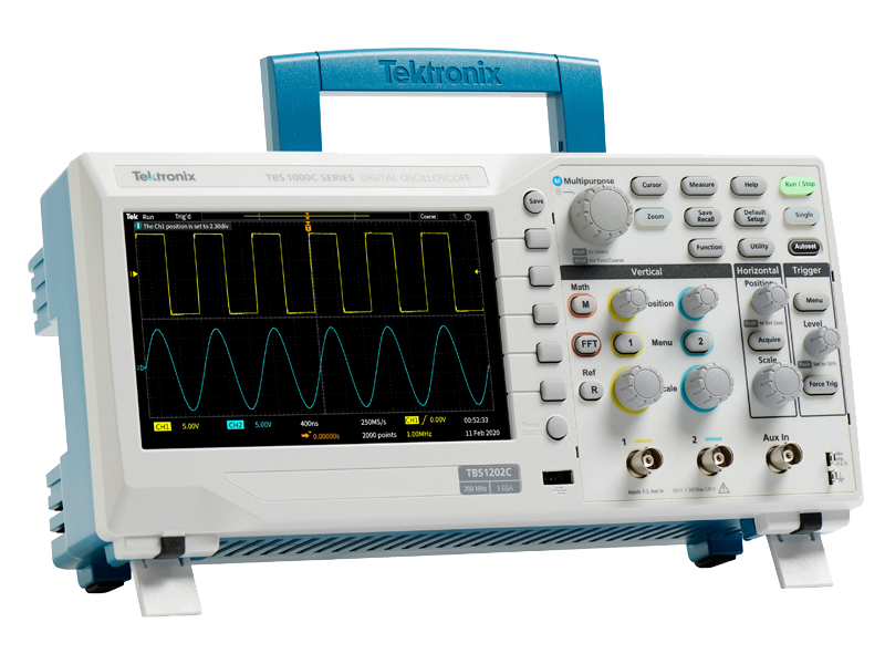 Offering affordable performance in a compact design, the TBS1000C Oscilloscope provides the features, versatility and durability required by today's educational institutions, embedded designers, and maker community. The TBS1000C includes a 7-inch WVGA color display with up to 1 GS/s sample rate, bandwidths from 50 MHz to 200 MHz and a five-year warranty. Its innovative courseware system integrates lab exercises with step-by-step instructions for students. The HelpEverywhere® system provides useful tips and hints throughout the user interface to make the instrument more approachable to a new user.